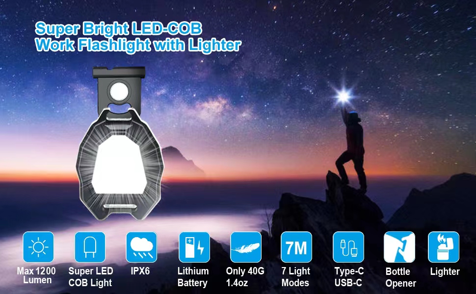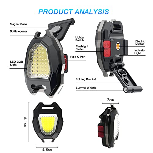 With Lighter Function Design: This rechargeable COB keychain flashlights design with tungsten flameless lighter function, just long press the lighter switch for 3 seconds(10 seconds automatically off), you can quickly ignite, especially suitable for field or emergency fetching fire.