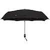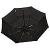 Black, full-size travel umbrella closes to a compact size
