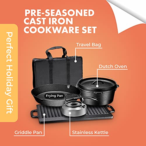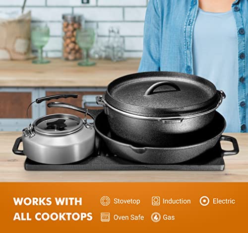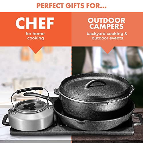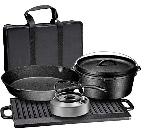 Pre-Seasoned 12″ Cast Iron Skillet, 4.5qt Dutch Oven Pot, 2.5qt Saucepot, 20″ x 9″ Heavy-duty Reversible Cast Iron Griddle. Also includes 8.6″ Trivet & Dutch Oven Lid Lifter