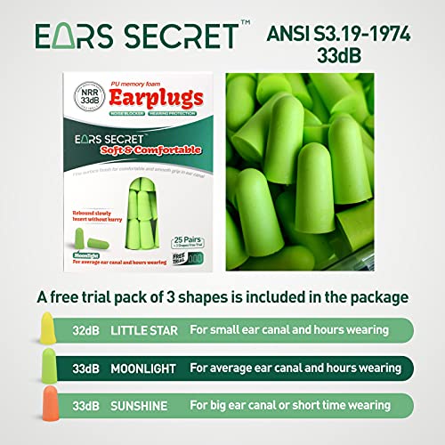 🦻【Perfect Choice】EARS SECRET manufactures SUNSHINE/MOONLIGHT/LITTLE STAR 3 shapes earplugs from big to small. This is MOONLIGHT the mid-sized one for the average ear canal. Foam earplugs sleep women and men, and sleeping noise cancelling. The smaller, the less pressure, the longer time in ear canal without pain. Using the right earplug can make your ears more comfortable experience.