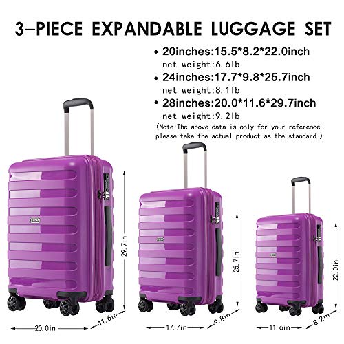 【3 Pcs Luggage Expandable double seal luggage】3 Pcs Luggage Expandable(All 20in, 24in and 28in are Expandable, adding 25%to the scalable space.) set to accommodate all your traveling needs ; Following sizes of suitcase are included: 20 inches(weight :7.3 lb), 24 inches(weight :9.3 lb) and 28 inches(weight :11.2 lb).Weight Capacity: 20inch: 33 lbs 24inch: 44 lbs 28inch: 55 lbs;