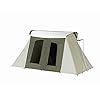 Whether you’re headed to the campground with your family, or elk camp with your hunting buddies, this rugged, all-season tent is well suited for the occasion. Made with premium grade, Hydra-Shield, 100% cotton duck canvas. The tight weave and silicone finish make the canvas watertight yet breathable, minimizing condensation and mugginess. Go ahead and touch the inside walls during a downpour—this canvas will not wick water. The Flex-Bow frame has tempered, spring steel rods that keep the tent taut, and robust 1-inch steel tube poles that will hold up to fierce winds. The floor material is a puncture resistant, 13.5 oz vinyl with welded seams, that keeps water out. Easy, one-person setup takes only a few minutes after you have it staked out. The steep walls and 6’1” high ceiling provide a roomy interior with stand-up, walk-around comfort. Large front and back doors with top rated #10 YKK zippers give convenient access. Four windows, and two vents allow ample air flow. Windows and vents have no-see-um screen mesh, keeping out the smallest bugs. A customizable gear organizer system offers plenty of places to stow gear. A large awning provides shade and a covered entry. Sturdy storage bags and hefty 12-inch steel stakes are included.