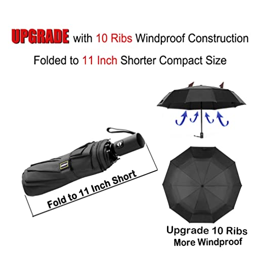 UPGRADE 10 RIBS WINDPROOF VENTED DOUBLE CANOPY CONSTRUCTION: Upgrade the ribs to 10 ribs, more windproof than 8 or 9 ribs. Plus with Vented DOUBLE CANOPY construction which allows the wind to pass through the vents, making the umbrella much easier to handle in harsh conditions without getting flipped or inverted easily in the wind. Shorter to 11″ long when folded, easy taking to anywhere. It is an ideal compact size travel umbrella.