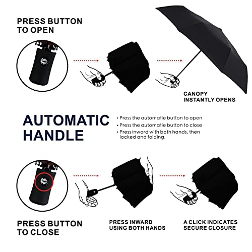 ⛱️【CONVENIENT AUTO OPEN/CLOSE IN ONE SECOND】-Just push the button once to automatically open and press again to instantly fold the canopy closed. You do not need to wait another second to open the umbrella when you get out of your car in the rain, especially in heavy rainfall, even when your hands are full of things.