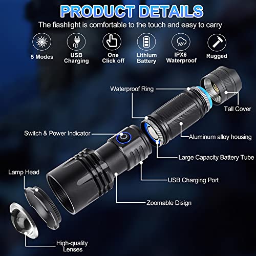 [USB Rechargeable] This rechargeable flashlight uses a 5000mAh rechargeable lithium battery, which is flashlights more durable while ensuring brightness. Tactical flashlight has a green/red power indicator. It allows you to charge the flashlight in time.