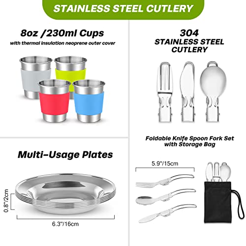 The Best Money You Ever Spent – The 29pcs camping cookware mess kit comes with 1 L pot, 1 M pot, 1 fry pan, 1 1.1L kettle, 1 2.6 gal collapsible container, 1 12L collapsible bucket, 4 x 230ml stainless steel cups with silicone protectors, 4 18cm stainless steel plates, 4 sets of dinner cutleries (4 forks, 4 knives, 4 spoons with 4 storage bags), 2 cleaning cloth and 1 carrying bag. This one-stop shopping camp cookware set is great for group camping cooking, emergency survival gear equipment.