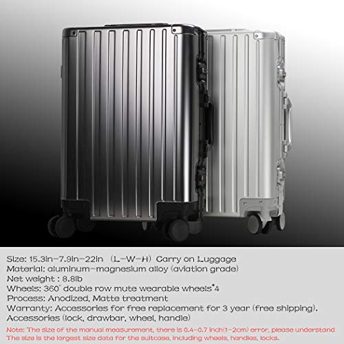 The alu20-inch carry on aluminum luggage. Internal dimensions: 13.7″x 7.7″ x 19″, suitcase net weight: 8.8 lbs. External dimensions 15.3″ x 7.9″ x 22″, capacity: 36 L.minum suitcase with multi-use organization packets that makes it easy to pack and organize your items. Provides additional protection for your items.