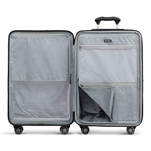 Be ready for any trip with the Travelpro® Roundtrip® Carry-on Luggage and Medium Check-in Expandable Spinner set. This hard sided luggage with spinner wheels features clean lines and built-in durability with 100% polycarbonate hard shells that flex on impact, molded corner guards for reinforcement on high-wear points and a stylish finish that reduces the visibility of scratches and scuffs. This carry on suitcase and check in suitcase has split case designs include a zippered expansion option to give you up to 2” more packing capacity per bag when needed, while interior divider panels, multiple accessory pockets and built-in TSA locks keep contents separated, organized and secure for this luggage 2 piece set. This hardside luggage set rolls with ease, each on eight 360° rotating wheels led by a 2-stop adjustable PowerScope Lite extension handle with Patented Contour Grip and comfortable rubberized finish. This carry on bag and large suitcase is backed by our Built For a Lifetime Limited Warranty with Trusted Companion Promise that even covers damage caused by airlines or other common carriers for the first year of the lifetime warranty.