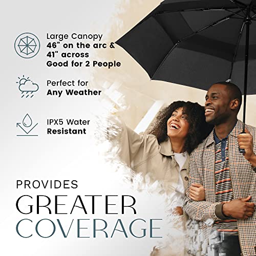 Stay Dry & Safe – This travel umbrella is constructed with a strong steel alloy frame with the most advanced materials designed for the ribs to prevent it from turning inside out. It’s a portable umbrella that features a vented canopy design, capable of withstanding heavy rains and forceful winds.