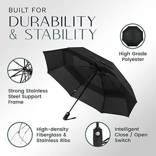 One-Handed Operation – You’ll love how easy it is to open and close this automatic umbrella. Simply press the button on the handle, and watch as it opens or closes with ease. It’s a heavy duty umbrella that you can use even when your hands are full as part of travel essentials!